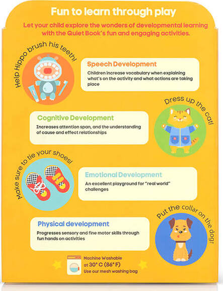 My Quiet Book is a Montessori Basic Skills Activity Toy. 10 activities tied together to a book of Montessori principles that improve their basic skills using real life challenges, tying shoelace, using a zipper, time learning and more. Ages 3 - 5 years