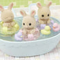 Welcome the Milk Rabbit cradle baby triplets to Calico Village! Set includes 3 Milk Rabbit Triplets Iris, Isla and Owen who are dressed in removable onesies. Care for the newborn triplets by giving them a bath! This ready to play set features pastel blue bathtub with three floaties, three rubber duck toys, watering can, measuring cup and toy choo-choo train.