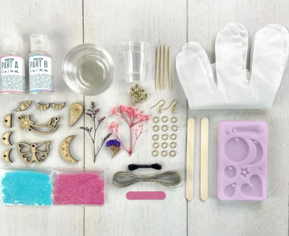 • Comes with 10 laser-cut wood charm, dried flowers, 2-part resin, 2 bags of glitter, 6 mixing cups, 2 wooden mixing sticks, 4 toothpicks,, high-tack sticker sheet,, 2 measuring cups, metallic floss, black cord, 10 metallic gold beads, 2 earring hooks, 15 jump rings, small file, 2 protective work gloves and instructions.