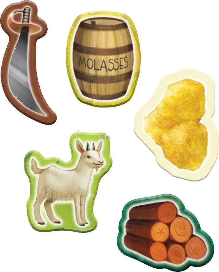 - two-sided game board, 28 pirate lairs and 32 ships in 4 colors, 106 resource tiles (gold, wood, goats, molasses, cutlasses), Coco tiles, 1 die, a Ghost Captain figure, a Ghost Captain die, and rulebook