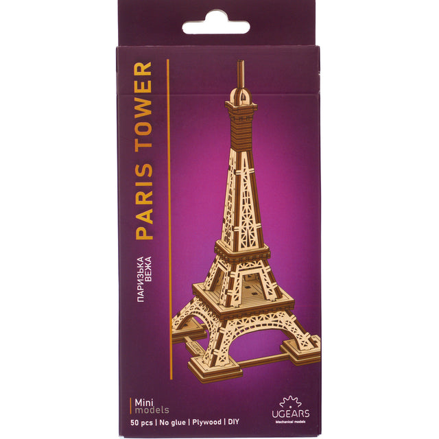 The Ugears Paris Tower model, from the World Cities collection, is a 1:1850 scale wooden DIY model of the iconic tower and stands 180 mm high. With 50 pieces made of art-quality composite wood, the Paris Tower is rated "Easy". You won't need glue or special tools to build the model, just push the pieces out of their laser pre-cut boards and snap them together. Illustrated instructions in 11 languages  guide your build. This static 3D puzzle is perfect for display on a shelf or table in your home or office.