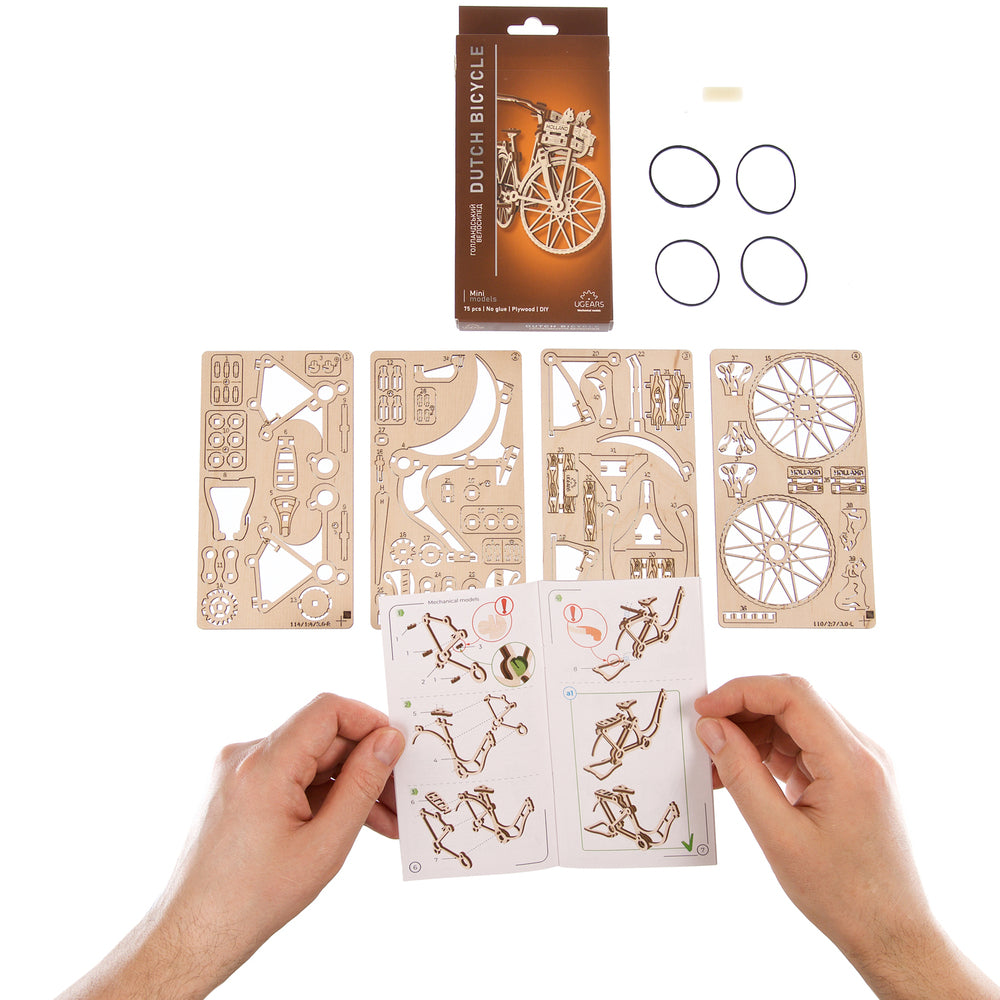 The Ugears Dutch Bicycle model, from the World Cities collection, is a classic bike with rear rack and front basket for doing your shopping, or for taking a friend or pet for a ride. Small models of a cat, dog, and flowers are included and can be placed in the basket. A rear kickstand and display mount allow the bike to stand upright for display. The model also features rotating pedals with a rubber chain that drives the rear wheel, a freely rotating front wheel, and moving handlebars. With 75 pieces made of art-quality composite wood, Ugears' DIY Dutch Bicycle is rated "Easy". You won't need glue or special tools to build this 3D puzzle, just push the pieces out of their laser pre-cut boards and snap them together. Illustrated instructions in 11 languages guide your build. Perfect for display on a shelf or table in your home or office.