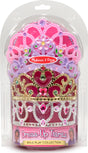 This fabulous four-pack of dress-up crowns and tiaras gives pretend play the royal touch! Designed in consultation with moms (and their little princesses!), the headband tiaras have been painstakingly designed to be pinch-free, the comb-backed crowns won't tangle, and all are made with the very best materials we could find--so they're tough enough to stand up to years of play and look gorgeous for years to come. These glamorous and durable playtime accessories include four unique designs, each with its own royal style: Two metallic crowns (gold and silver) with recessed beveling shine with painted-jewel accents; two pearlescent tiaras (flowered lavender and jeweled pink) are fit for a prima ballerina or fairy queen. The set coordinates with Melissa & Doug's Goodie Tutus dress-up skirts collection and Step In Style dress-up shoes collections.