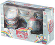 A beautiful 15 piece tin tea set featuring everyone's favorite fantasy creature, all wonderfully decorated with whimsical unicorns and rainbows