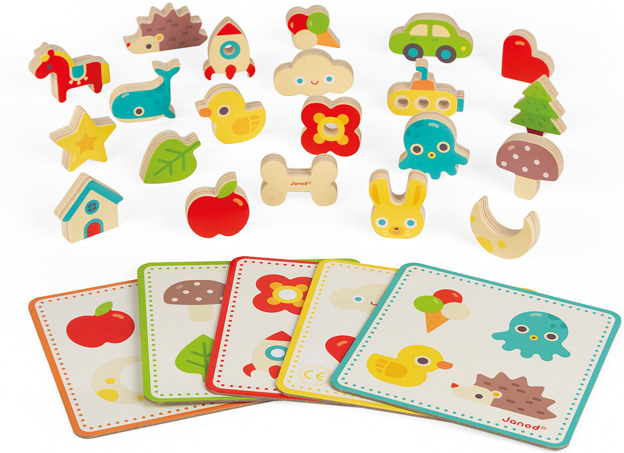 From 2 to 5 players. 21 wooden pieces, one cotton bag and 5 game cards. Put your hand in the bag and try to be the first to find the 4 pieces indicated on the game card, using only your sense of touch! But beware the “trick” piece! The player who picks the bone must return any pieces already won to the bag. Variant for toddlers: each player may also take turns drawing a piece from the bag. If it appears on their game card, the player places it on top. An ideal game for developing your child’s sense of touch and fine motor skills. Wood : plywood for the pieces. Thick fabric bag. Heat transfer printing on both sides of the pieces. Ages 3 to 6