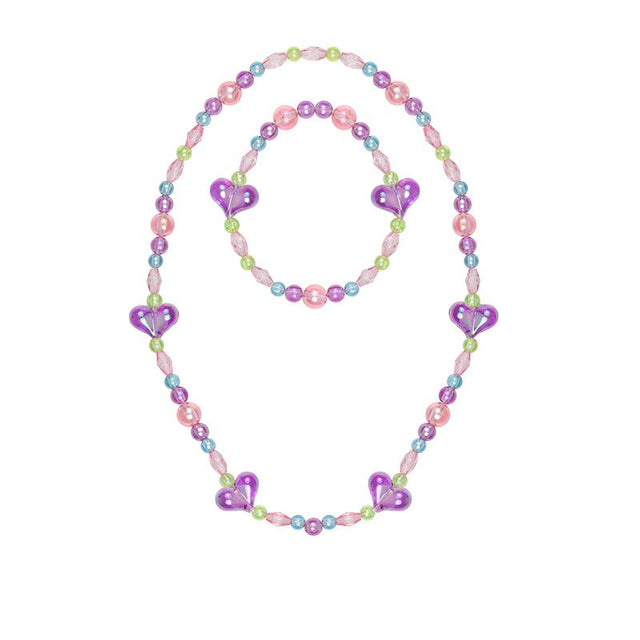Your heart will go on loving this snappy 2 piece bracelet necklace set. Beaded on a stretchy elastic with a fun sequence of clear coloured beads and large hearts.