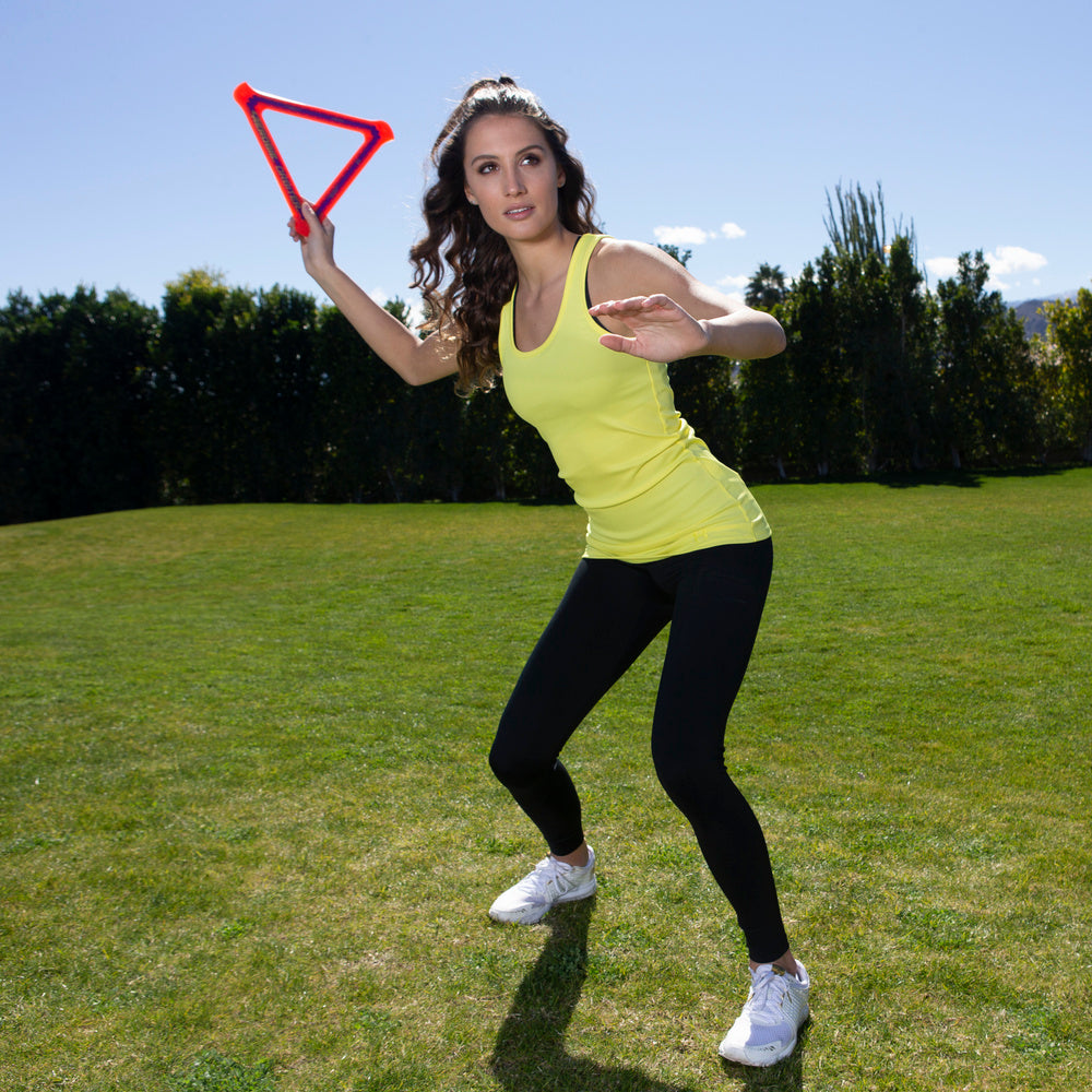 The Aerobie Orbiter Boomerang delivers out of this world performance! This boomerang disk travels up to 90 feet before it travels back to you. The soft edges and triangle shape provide a secure grip, so it’s easier to throw and catch. The open center allows each player to personalize their throwing and catching style – catch the edge with your hand or use the center to catch it with your arm or foot. Create your signature moves with Aerobie flying discs! The Aerobie Orbiter Boomerang measures 11.5 inches on each side. Available in assorted neon colors. Sold individually. Note: This item does not float in water. Ages: 13+.