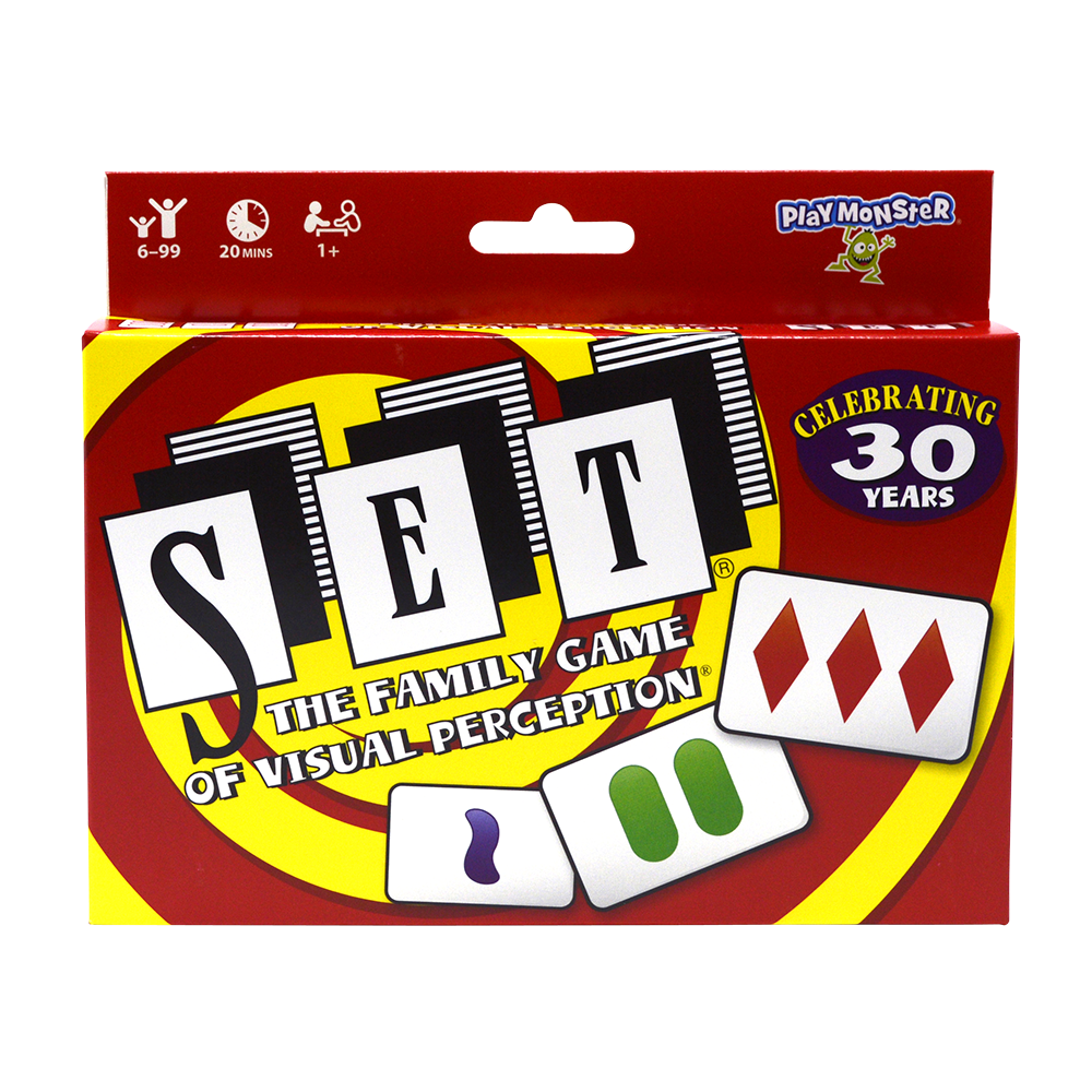 The award-winning game challenges players to race to find as many SETs as they can! A SET is three cards where each individual feature (color, shape, number and shading) is either all the same OR all different! The first player to see a SET calls out “SET” and grabs the cards—there are no “turns” and no luck here! And not only is it fast-paced fun, it also builds skills and exercises the brain! Because it has a rule of logic, and because players must apply this rule to the spatial array of patterns all at once, they must use both left brain and right brain thought processes! At the end of the game, the player with the most SETs wins! SET is prefect for a wide age range and number of players (including solo play!), and is a fun intergenerational game as well.