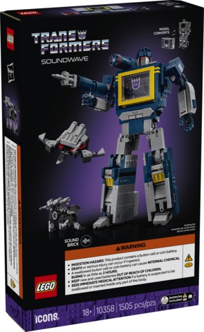 What’s in the box? – Everything you need to craft a detailed LEGO® Icons Transformers: Soundwave figure with rocket pod, laser blaster and dart accessories, plus Ravage and Laserbeak figures