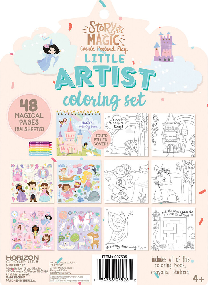 Create. Pretend. Play. Immerse yourself in the whimsical world of Story Magic with the Little Artist Coloring Set! Squish and squeeze the liquid-filled cover of the spiral-bound coloring book to find 48 pages of magical, ready-to-color designs — from dreamy castles to enchanted forests and mer-mazing friends!