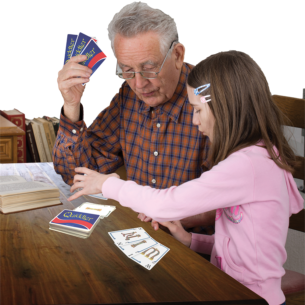 Quiddler is easy to learn and fun for everyone! Because it’s The SHORT Word Game®, it attracts non-word-game players as well as people who love word games! The goal is to arrange all the cards in your hand into one or more words. The number of cards dealt increases each round – starting with three cards and ending with 10 cards. High score wins, so use your high point letters and Quiddler’s unique double letter cards — but don’t get caught with them in your hand! Aim for the bonuses—one for the most words and one for the longest word! It’s great for families and parties! Plus, it sharpens skills like spelling, vocabulary and critical thinking, so teachers love it, too!