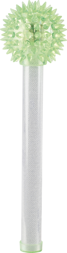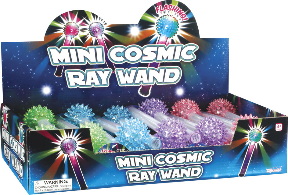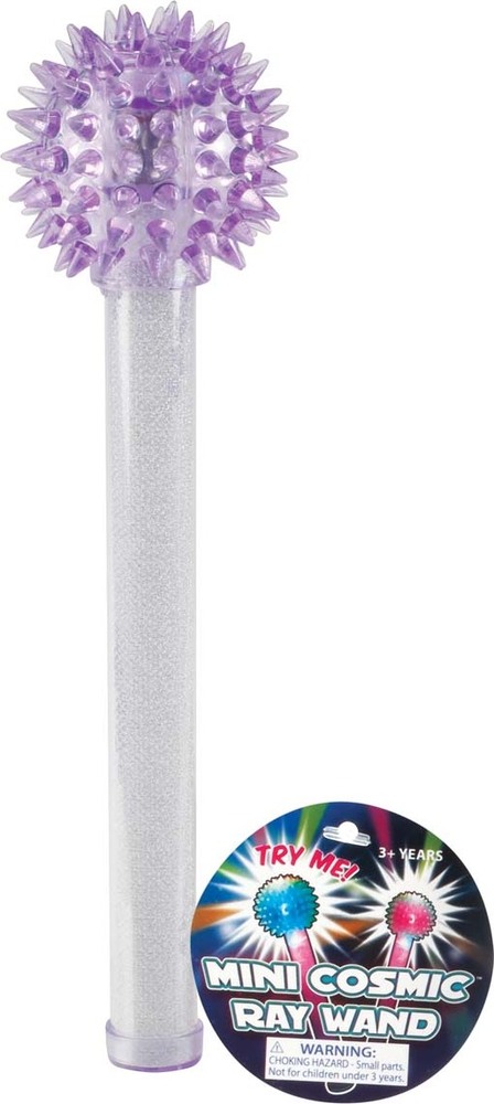Tap this miniature version of Toysmith’s popular Cosmic Ray Light-Up Wand for a 15-second flashing multicolored light show. The Mini Light-Up Cosmic Ray Wand has a squeezable soft rubber spiky top and comes in 4 assorted colors. Available in pink, blue, purple, and green. Each wand includes nonreplaceable batteries. Ages 3+