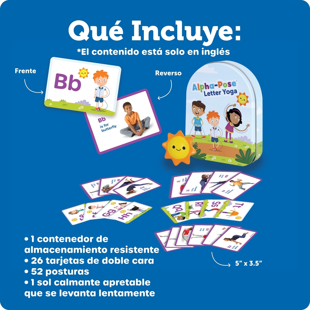 Practice your ABCs while learning kid-friendly yoga poses! This set of 26 double-sided cards pairs upper- and lowercase letters with real-life imagery of vocabulary words and kid-friendly yoga poses starting with every letter of the alphabet. Plus, the squeezable slow-rise foam sun gives kids a tactile way to calm down and refocus. When yoga time is done for the day, everything stores in a tin box for easy storage. Age 4+ | Grade PreK+